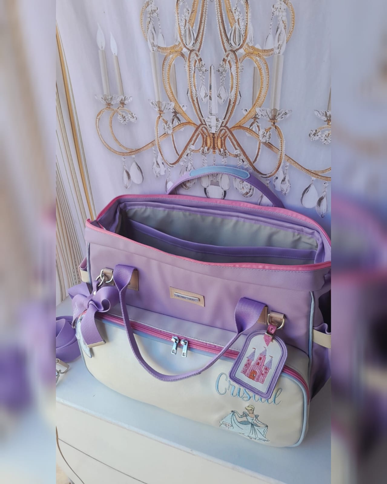 * Acompanha acessórios: chaveiro de laço com nome bordado, chaveiro em formato de castelo e chaveiro em formato de sapatinho.